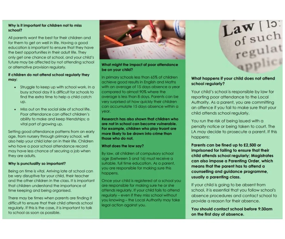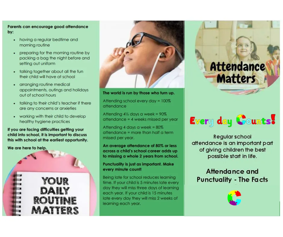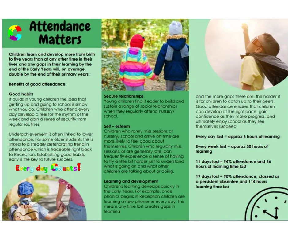 For children to gain the greatest benefit from their education it is vital that they attend regularly and it is the duty of our school and parents/carers to make sure that each child is at school, on time, on every day that the school is open - unless the reason for the absence is unavoidable.