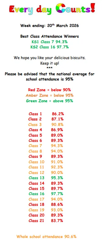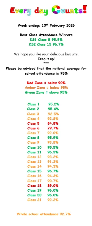 - Within a year group classes compete against each other to earn a letter for every day that the class attendance is 100% to complete the slogan ‘Everyday Counts!’